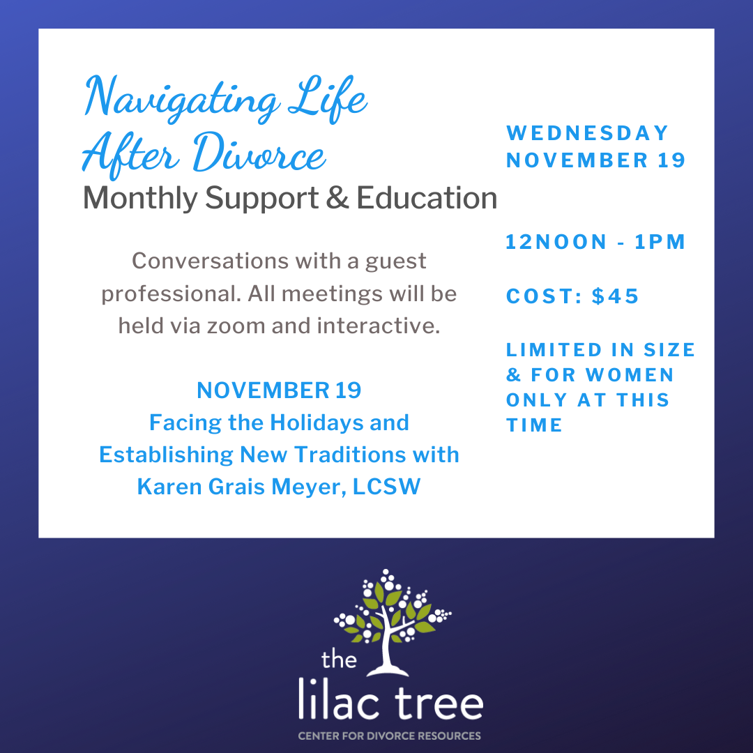 Join us via zoom for an informal Q&A session to talk about facing the holidays, new traditions and more with our Lilac Tree Advisory Council member, Karen Grais Meyer, LCSW