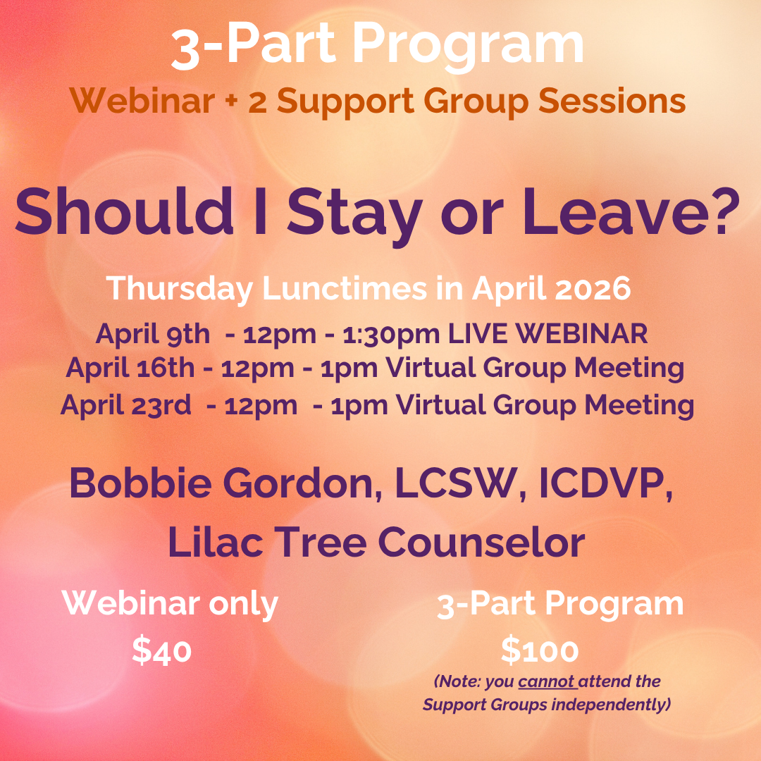 Contemplating the decision to Stay or Leave is complicated. Join us to safely, confidentially and compassionately talk through the common decision-making elements people consider.